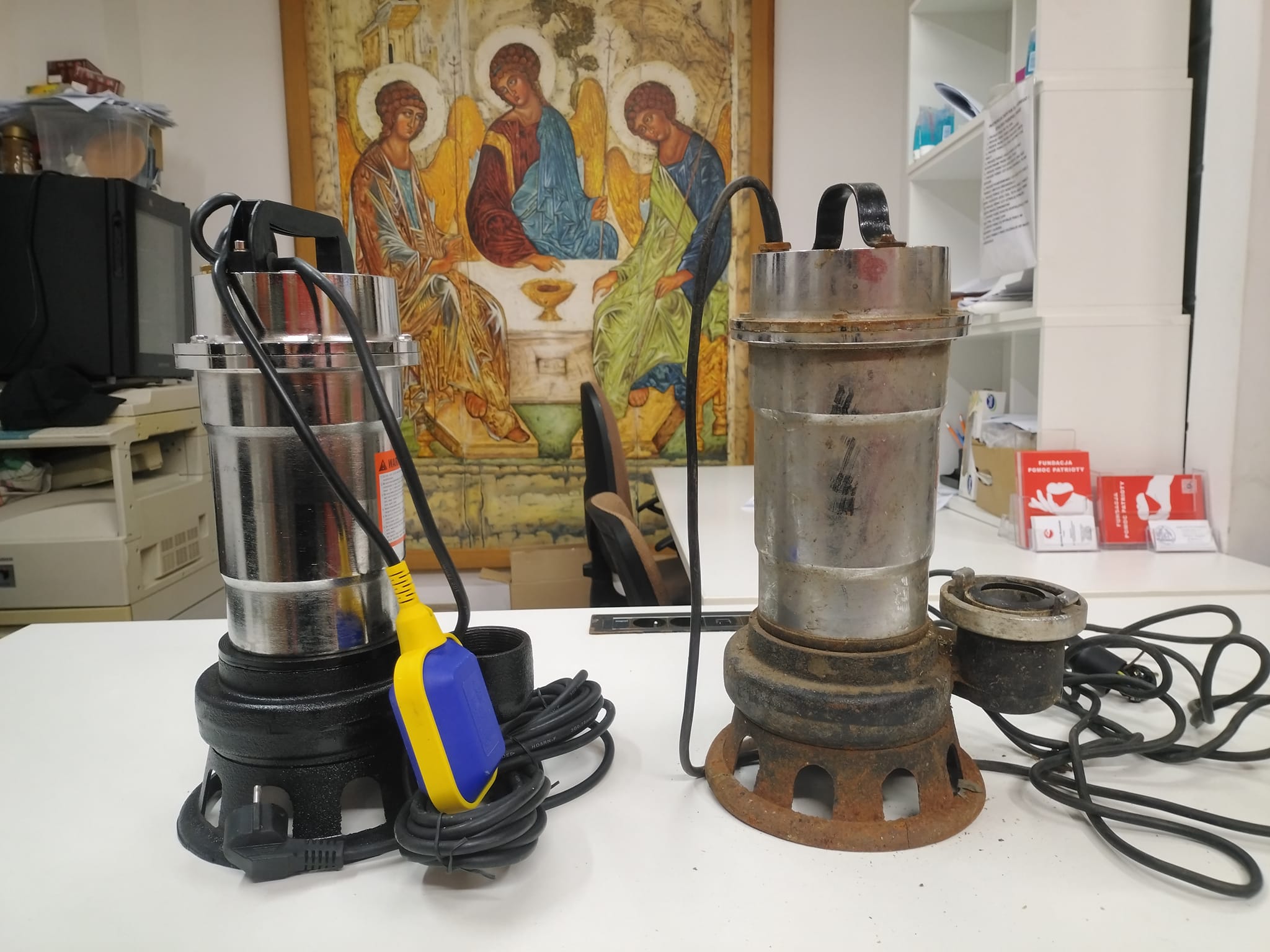 Jakiś czas temu zakupiliśmy nową pompę. Jest ona w naszym przypadku koniecznym narzędziem. Tuż przy wejściu do Punktu Przyjęć Potrzebujących znajduje się studzienka, którą trzeba opróżniać z wody, jeśli tego nie zrobimy zaleje nam lokal. Starą pompę chcemy uratować, miejmy nadzieję, że się uda. Dziękujemy wszystkim Darczyńcom, którzy dołożyli się do zakupu nowej pompy.
