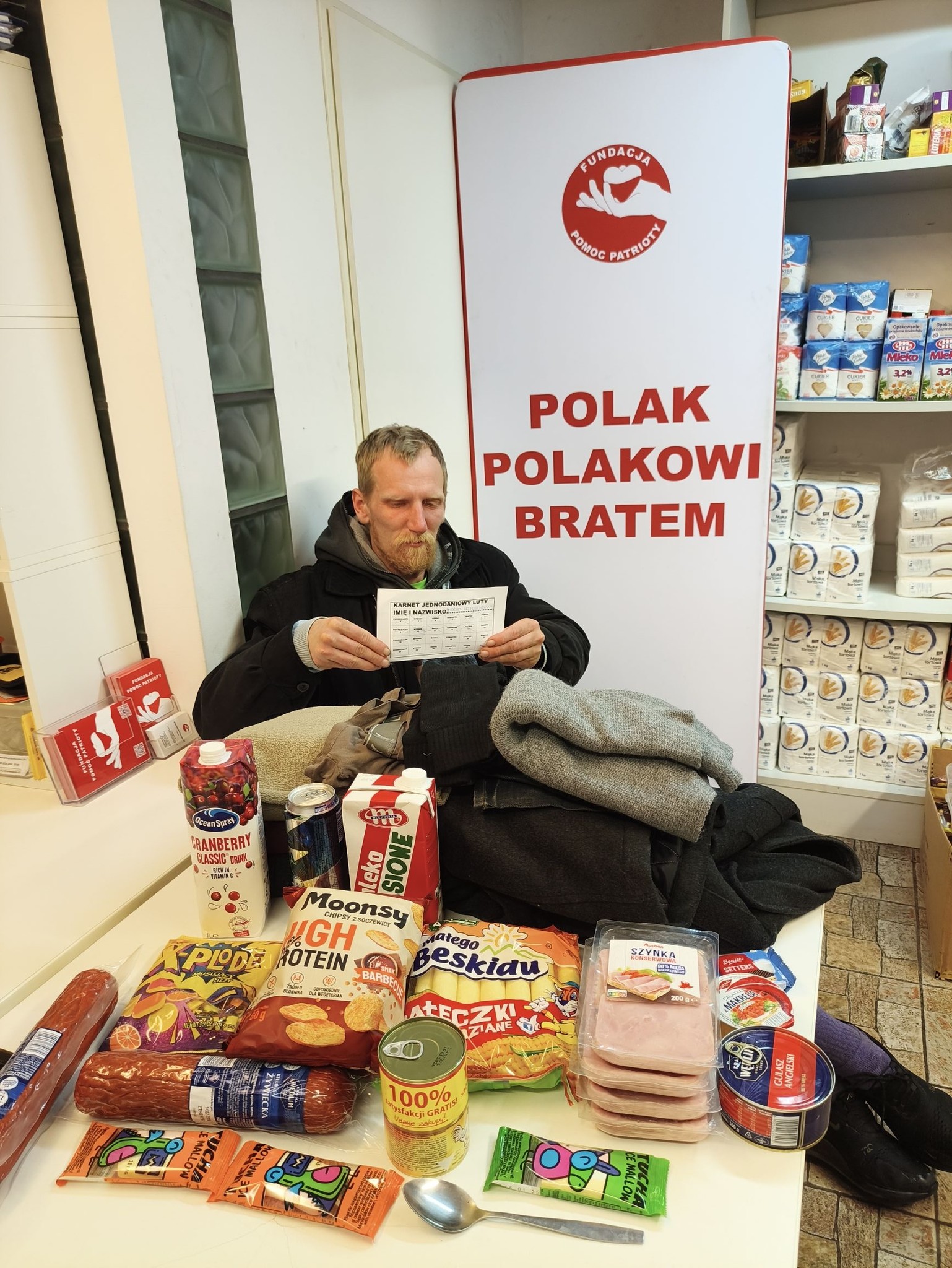 Polak Polakowi Bratem❗W Punkcie Przyjęć Potrzebujących nasi Wolontariusze kol. Michał, kol. Daniel i kol. Mariusz przyjęli nowego Podopiecznego p. Andrzeja lat 33, bezdomny od kilku miesięcy, utrzymuje się z renty 1200 zł, niestety zagubił dowód i nie może wybrać swoich środków, mieszka pod śmietnikiem, posiada lekki stopień niepełnosprawności, całe życie dotosłe na rencie, nie ma stażu pracy, ma 3 dzieci, ale są w domu dziecka.