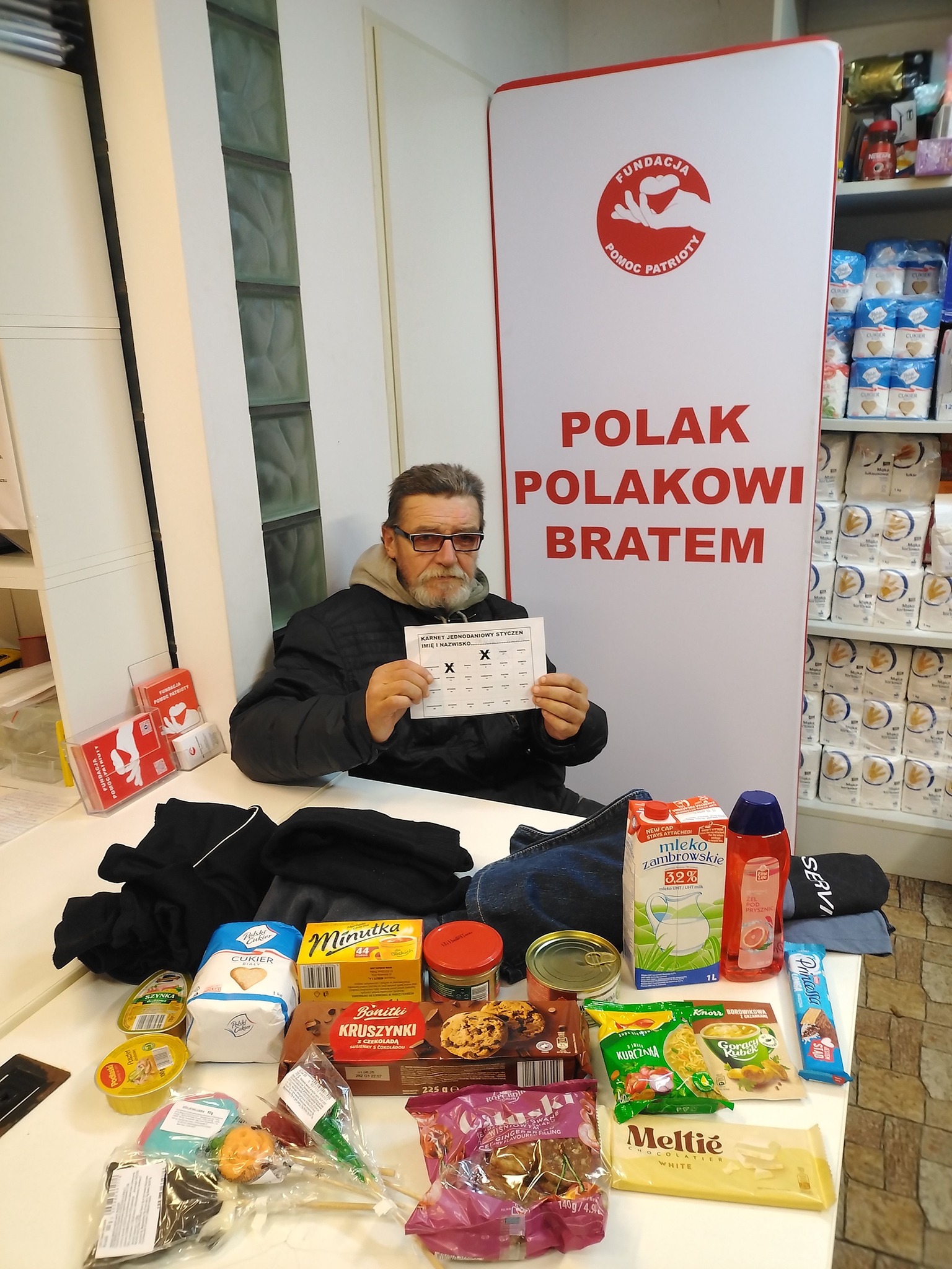 Polak Polakowi Bratem❗W Punkcie Przyjęć Potrzebujących nasi Wolontariusze kol. Piotr, kol. Daniel i kol. Michał i kol. Mariusz przyjęli nowego Podopiecznego p. Zbigniewa lat 67, utrzymuje się z emerytury 1600 zł, komornik zabiera 800 zł, bezdomny od 3 lat, mieszka w noclegowni, ma 2 dzieci, nie pomagają, staż pracy to 30 lat jako mechanik urządzeń pomiarowo doświadczalnych i jako budowlaniec.